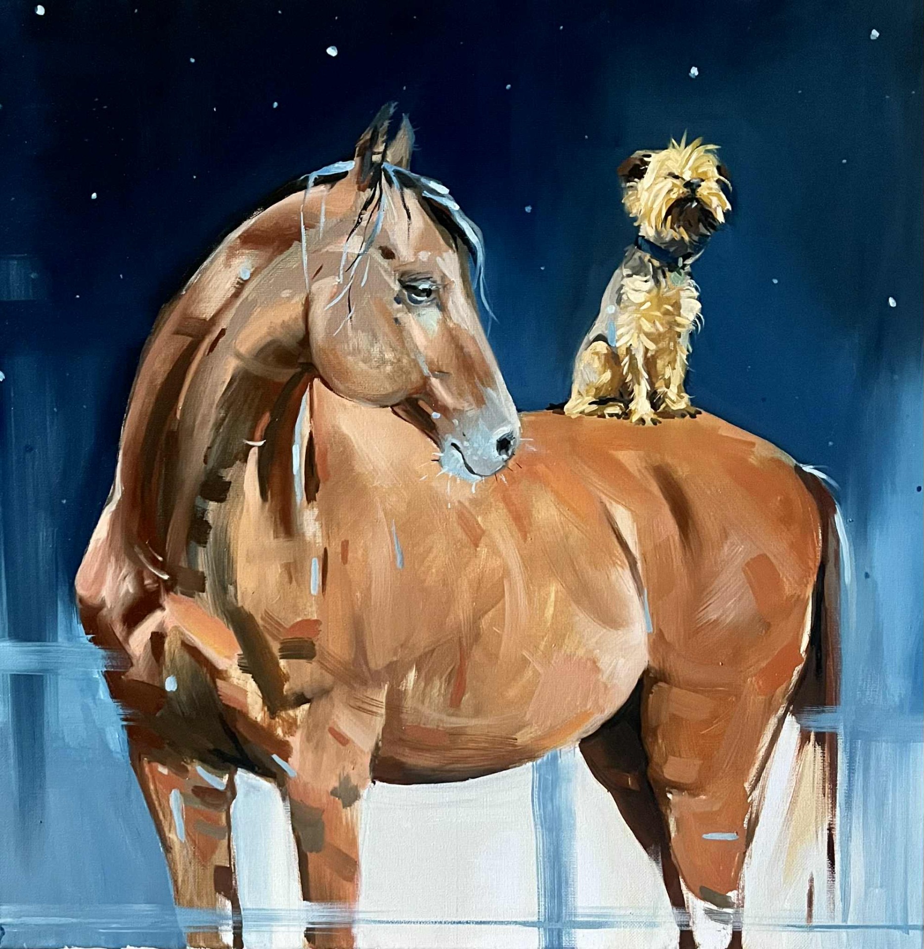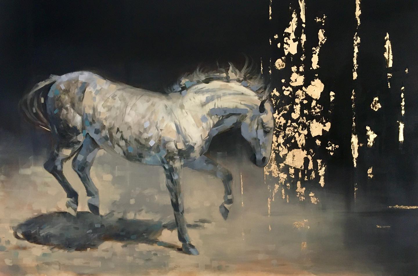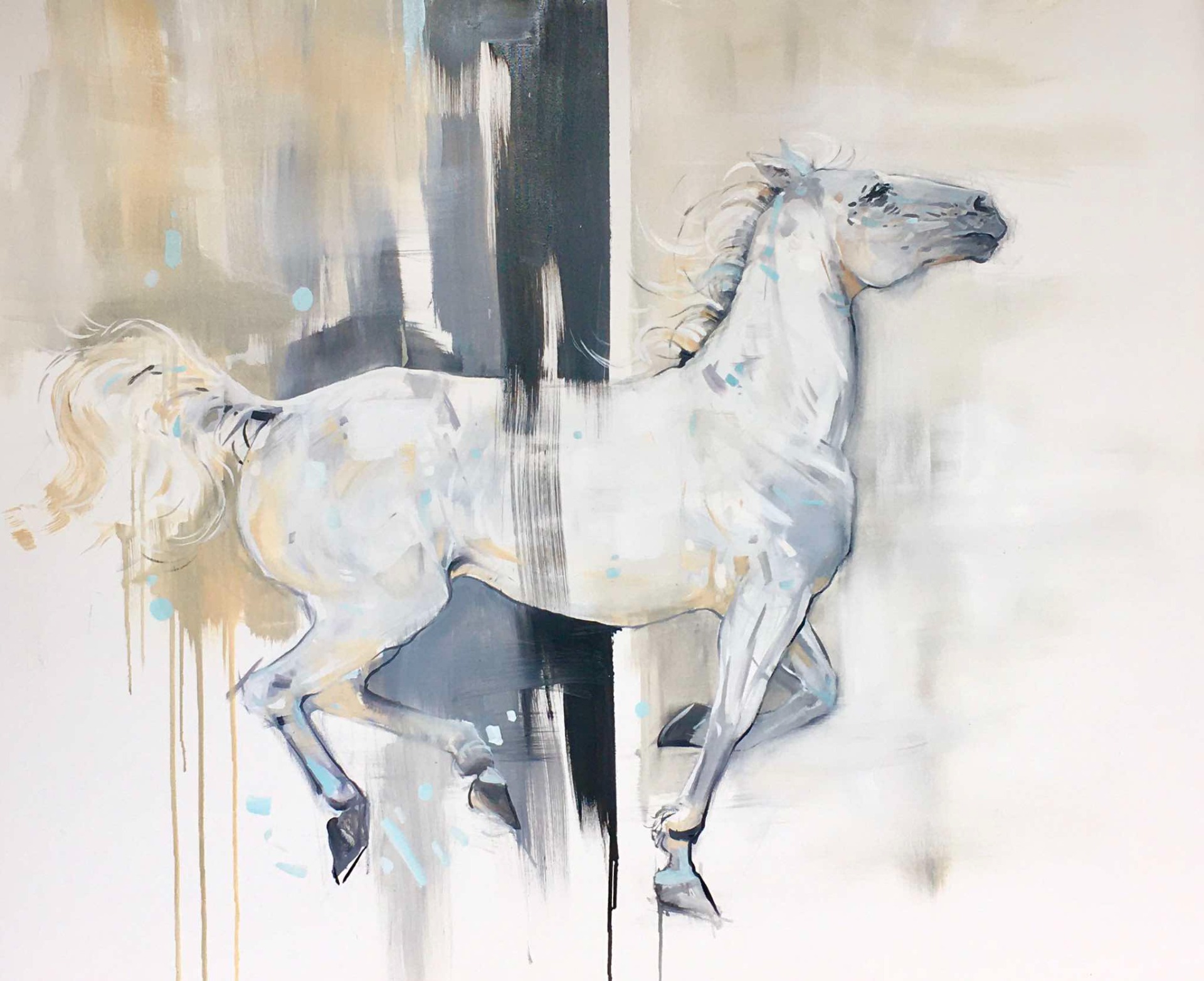 A festmény egy olyan jelenetet mutat, ahol jószerével csak egy fátyolnyi fal állít akadályt a lendületben lévő hatalmas hátasnak. Sokszor nincs előttünk fizikai akadály, mely az utunkat állná, mégis megtorpanunk.